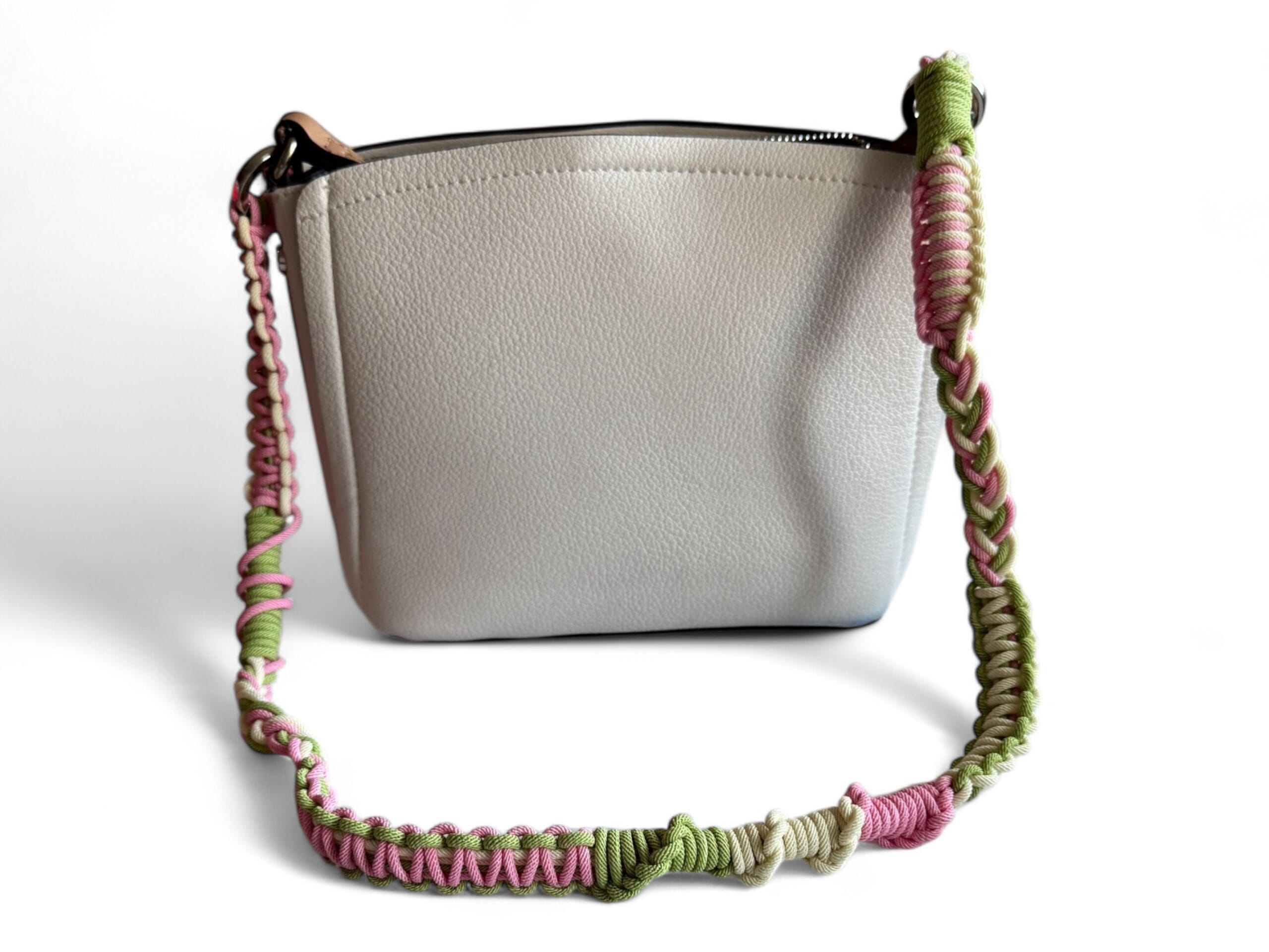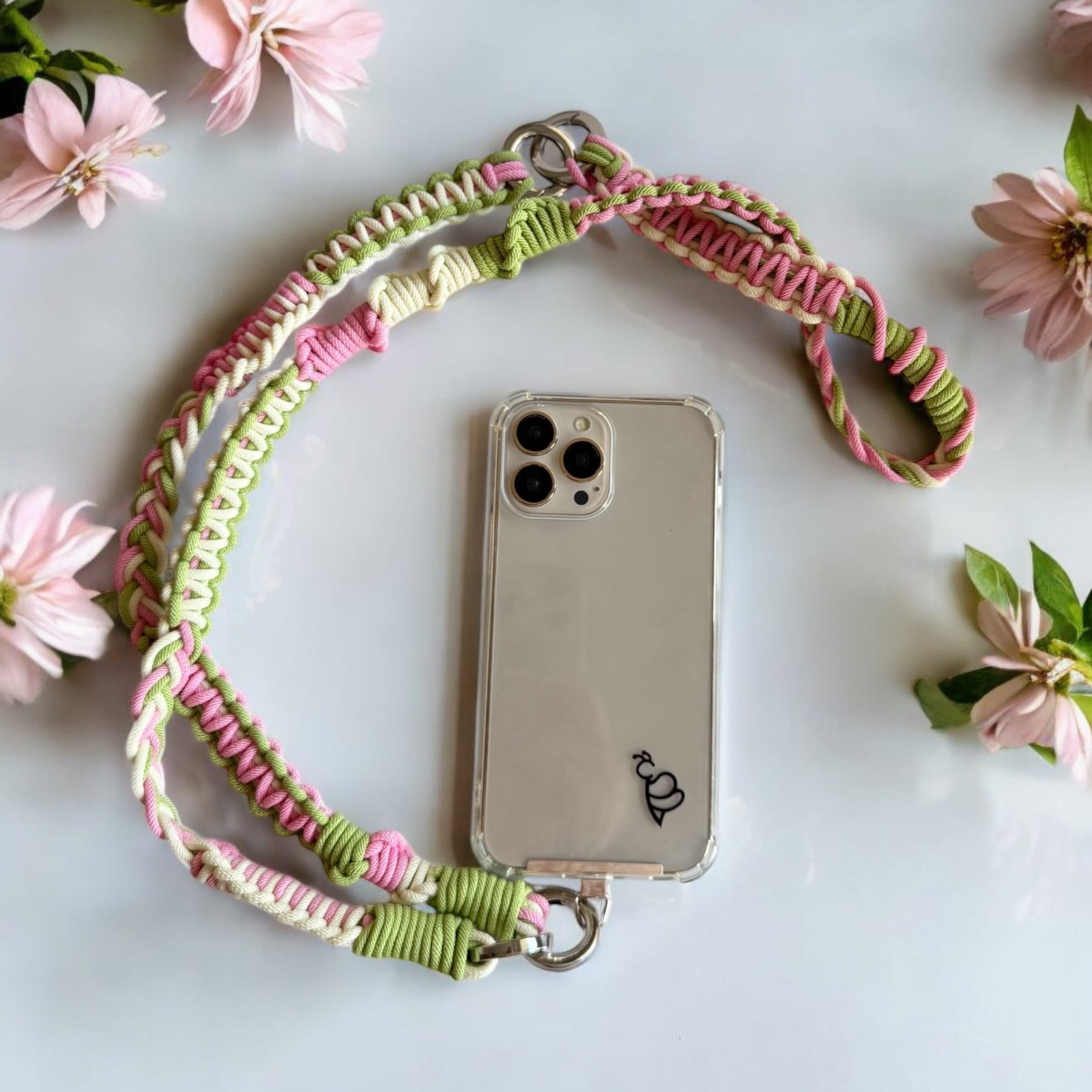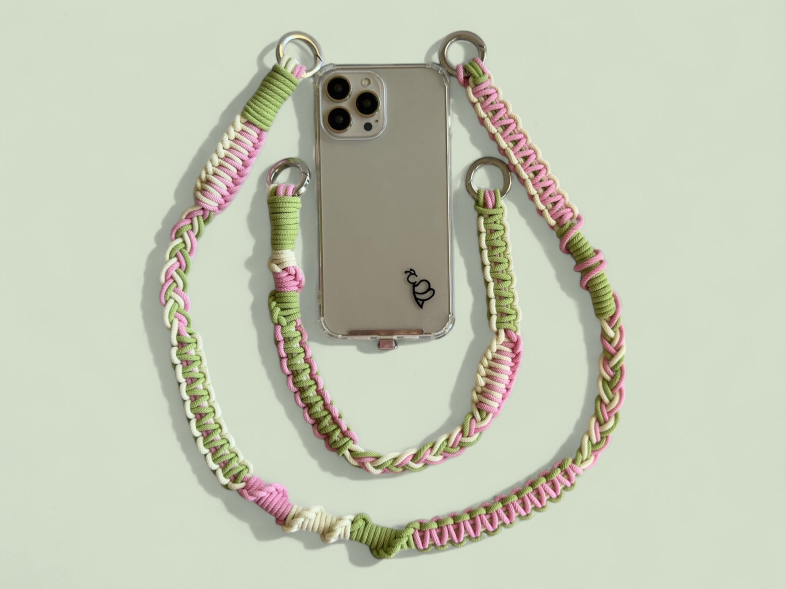 Flo – pasek do telefonu to stylowy i praktyczny dodatek, wykonany z wysokiej jakości plecionego materiału w pastelowych odcieniach limonki 🍋🟩, pudrowego różu i kremowego. Jest lekki, ale wytrzymały – idealny do codziennego noszenia, kiedy chcesz połączyć wygodę z subtelnym akcentem kolorystycznym.