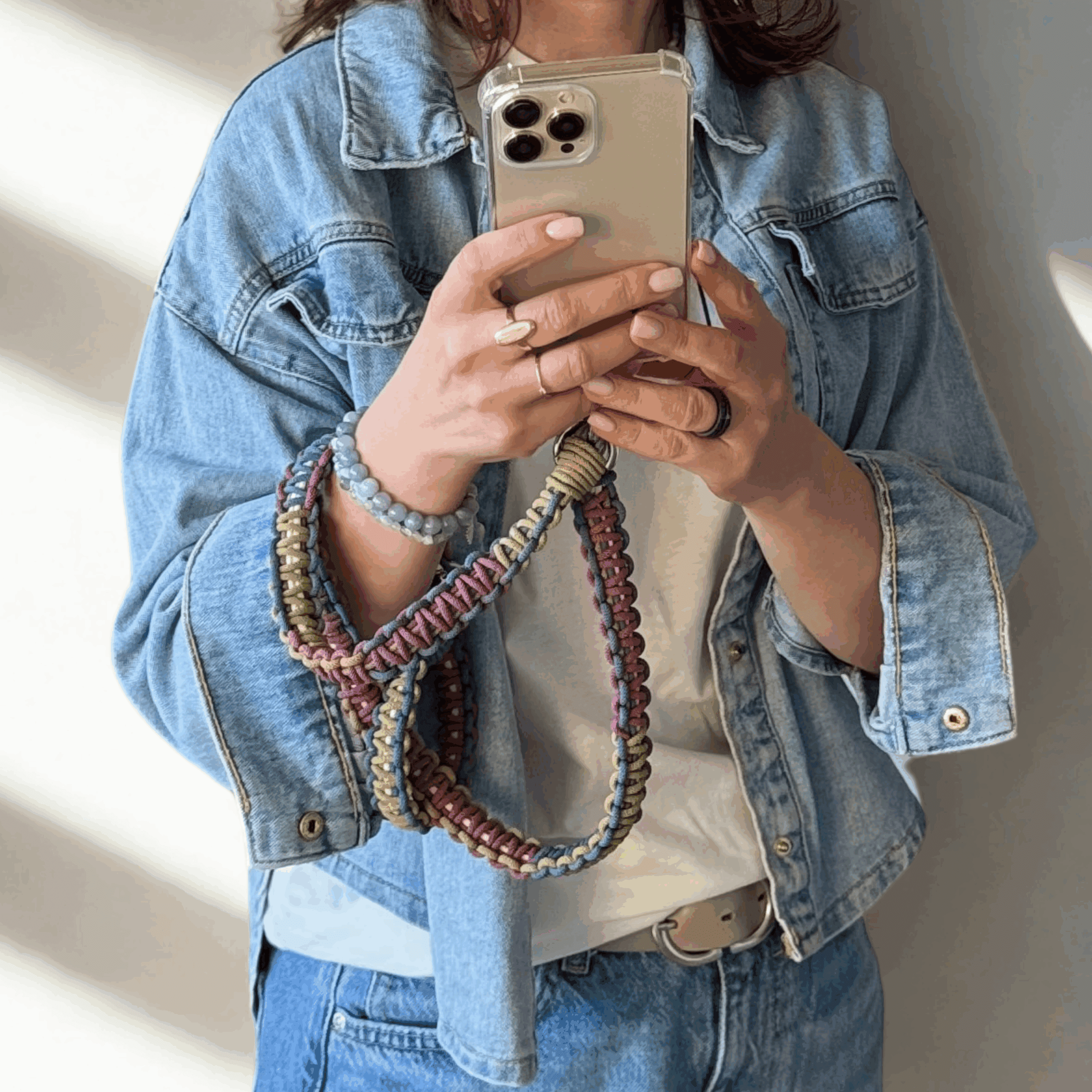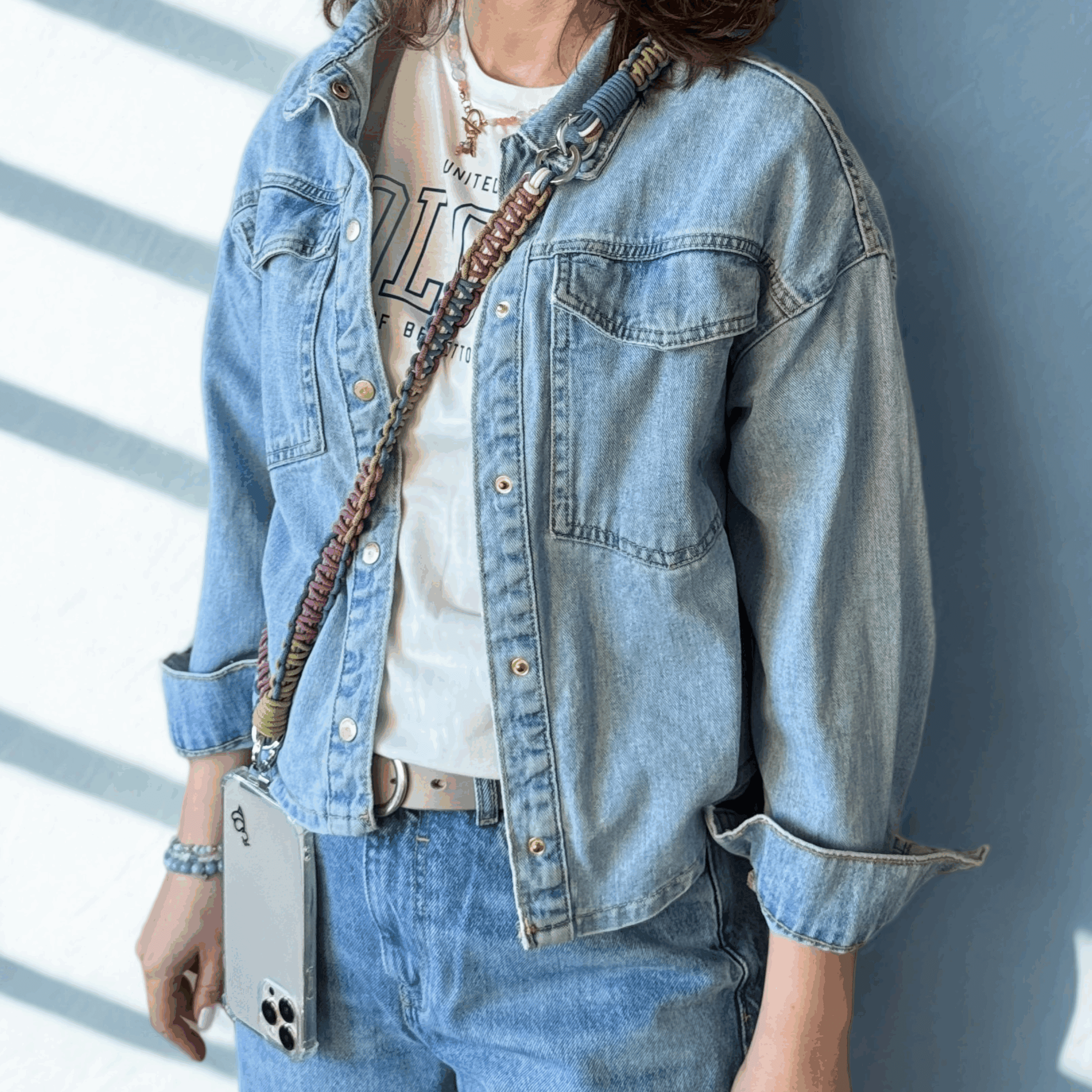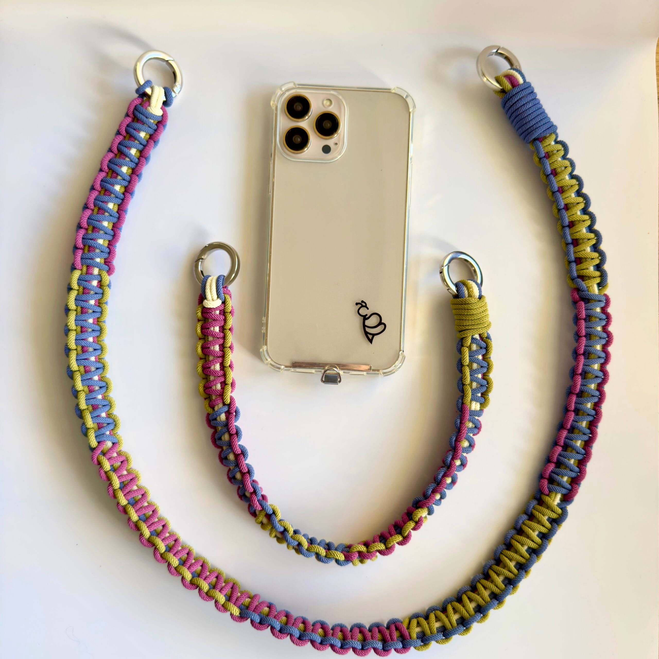 Jeśli kochasz subtelne, kojące kolory i minimalistyczny styl – Ava jest właśnie dla Ciebie. Ten sznurek do telefonu łączy trzy stonowane barwy: chłodny niebieski, łagodny fiolet i zgaszoną zieleń, tworząc delikatną kompozycję, która świetnie pasuje do codziennych stylizacji.